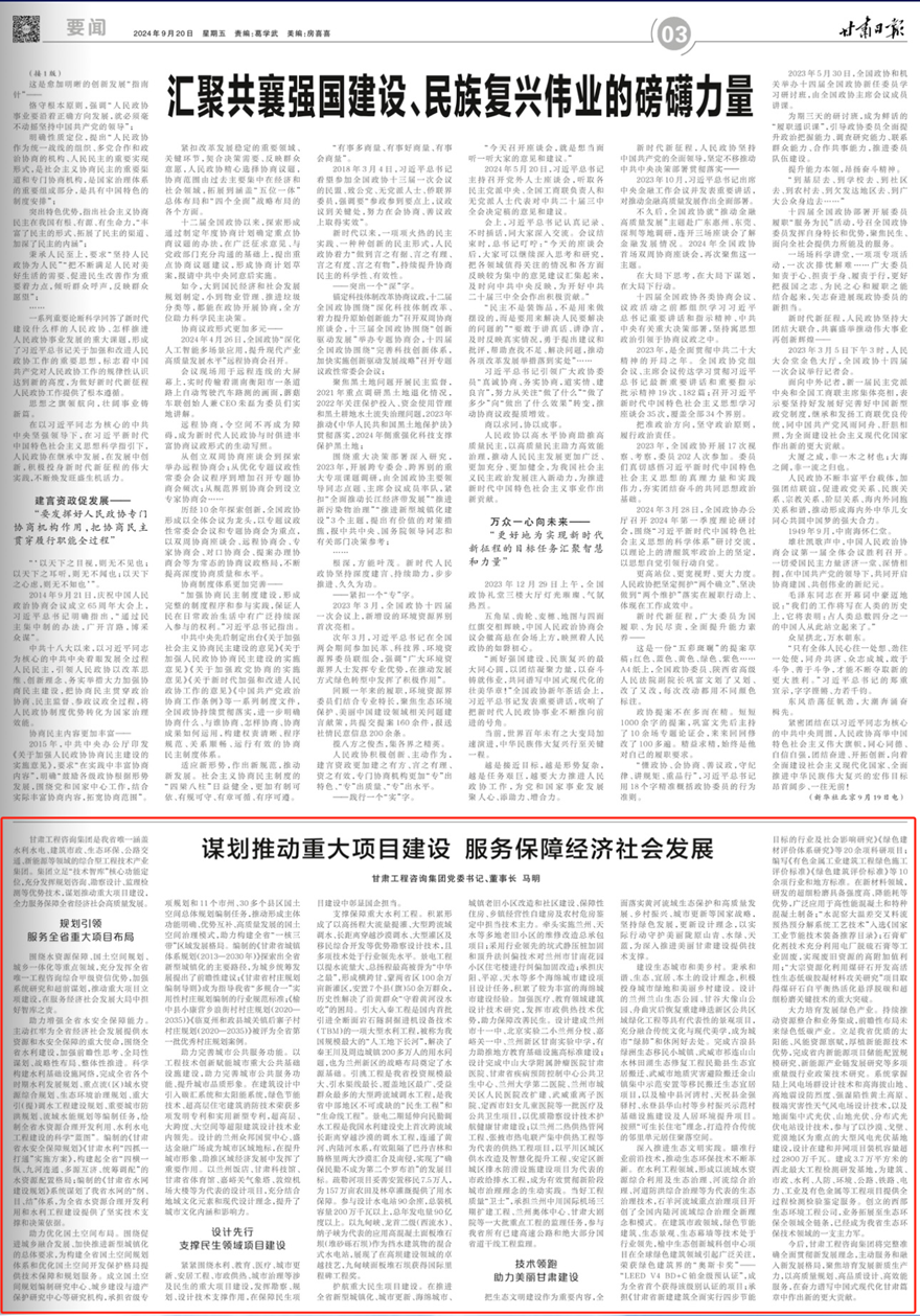 今后,甘肅工程咨詢集團(tuán)將完整準(zhǔn)確全面貫徹新發(fā)展理念,主動(dòng)服務(wù)和融入新發(fā)展格局,聚焦培育發(fā)展新質(zhì)生產(chǎn)力,以高質(zhì)量規(guī)劃、高品質(zhì)設(shè)計(jì)、高效能服務(wù),在奮力譜寫中國式現(xiàn)代化甘肅篇章中作出新的更大貢獻(xiàn)。