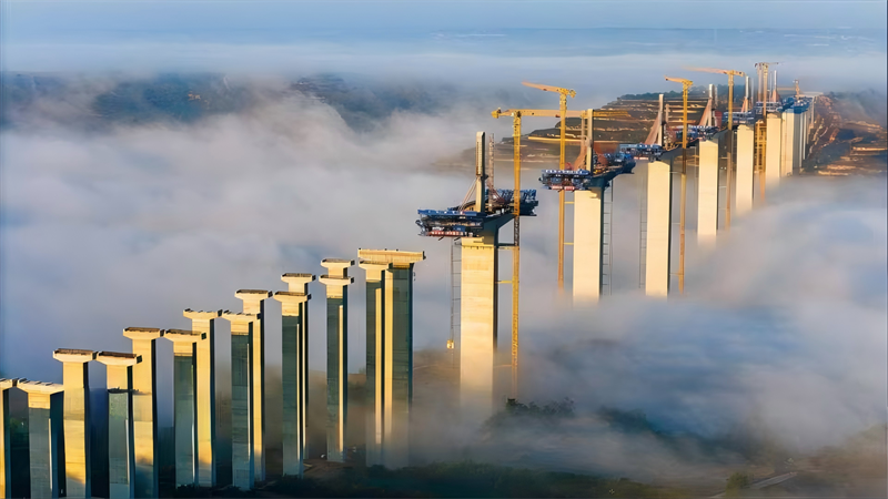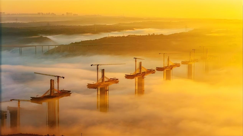 晨光初現(xiàn),建設中的橋梁在薄霧中若隱若現(xiàn),跨越河流、連接兩岸,為隴東大地經(jīng)濟騰飛插上翅膀。