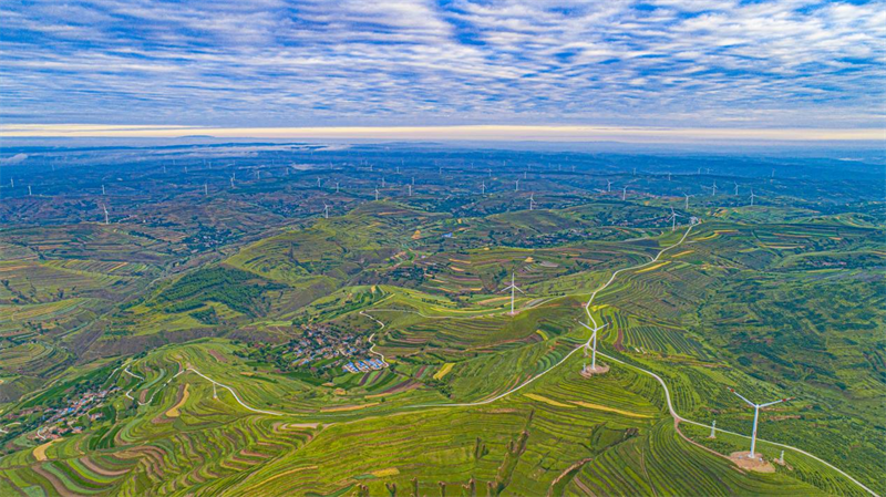 梯田蜿蜒起伏,村莊錯落有致,云海連綿不絕,風車悠然旋轉(zhuǎn),織就了人與自然和諧共生的美麗畫卷。