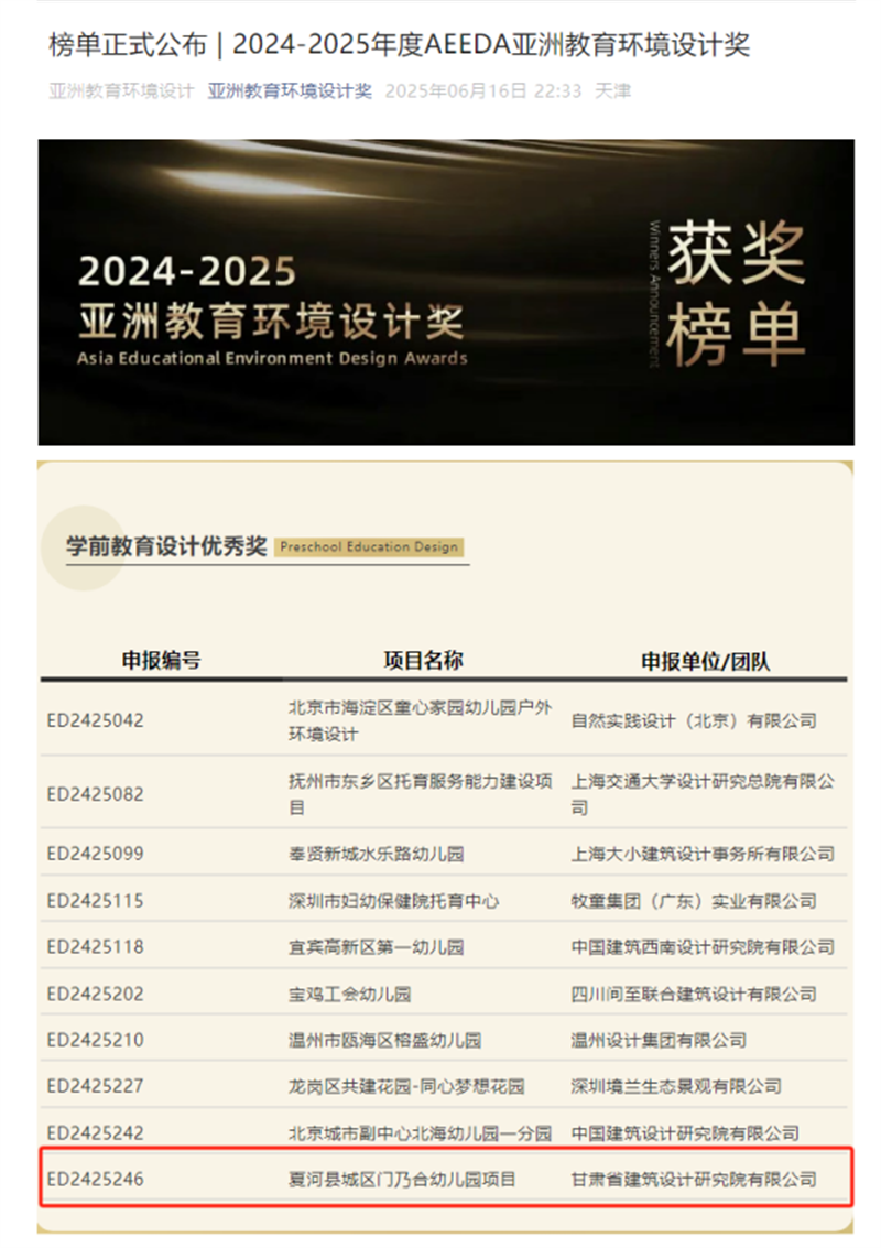 近日,備受矚目的2024-2025年度AEEDA亞洲教育環(huán)境設計獎(Asia Educational Environment Design Awards)獲獎名單正式揭曉。由甘肅工程咨詢集團旗下省建筑設計院設計的夏河縣城區(qū)門乃合幼兒園項目,從百余件參賽作品中脫穎而出,榮膺學前教育設計領域優(yōu)秀獎,為甘肅建筑設計行業(yè)贏得了國際聲譽。