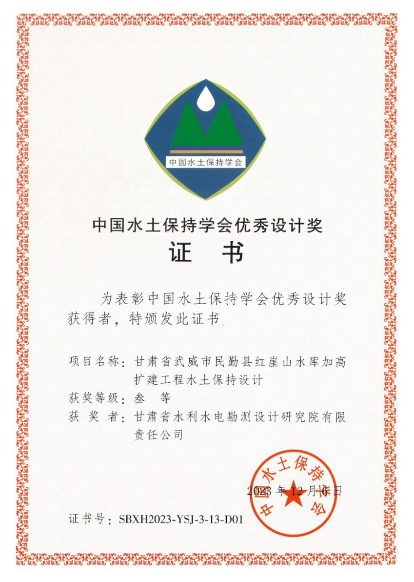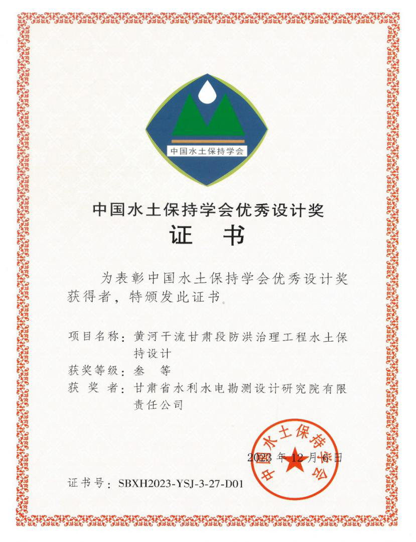 據(jù)悉,這是繼《甘肅省引洮供水一期工程水土保持設(shè)計(jì)》獲第三屆中國水土保持學(xué)術(shù)大會(huì)優(yōu)秀設(shè)計(jì)二等獎(jiǎng)后,再次喜獲此獎(jiǎng)項(xiàng)。中國水土保持學(xué)術(shù)大會(huì)制度自2018年建立以來,中國水土保持學(xué)會(huì)搭建了我國水土保持領(lǐng)域規(guī)模最大、水平最高的學(xué)術(shù)交流平臺(tái),現(xiàn)已成為中國水土保持學(xué)術(shù)交流的重要品牌。中國水土保持學(xué)會(huì)優(yōu)秀設(shè)計(jì)獎(jiǎng)每兩年評(píng)選一次,主要獎(jiǎng)勵(lì)我國在水土保持規(guī)劃與設(shè)計(jì)領(lǐng)域中技術(shù)先進(jìn)、成效顯著、理念創(chuàng)新的項(xiàng)目成果。