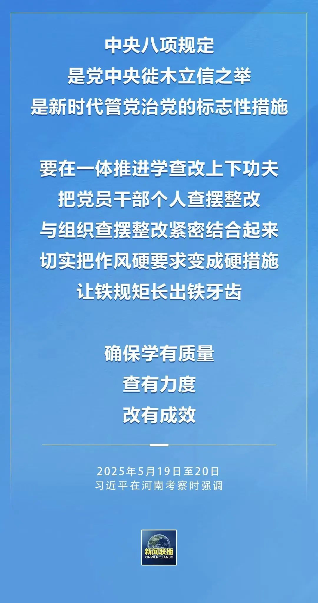習(xí)近平總書記在河南考察時(shí)對深入貫徹中央八項(xiàng)規(guī)定精神學(xué)習(xí)教育提出明確要求,強(qiáng)調(diào)“要在一體推進(jìn)學(xué)查改上下功夫”“確保學(xué)有質(zhì)量、查有力度、改有成效”。