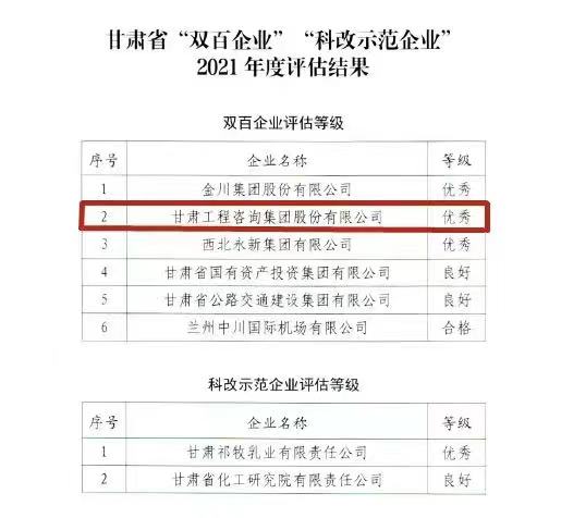 甘肅工程咨詢集團(tuán)獲甘肅省2021年度“雙百企業(yè)”評(píng)估“優(yōu)秀”等級(jí)