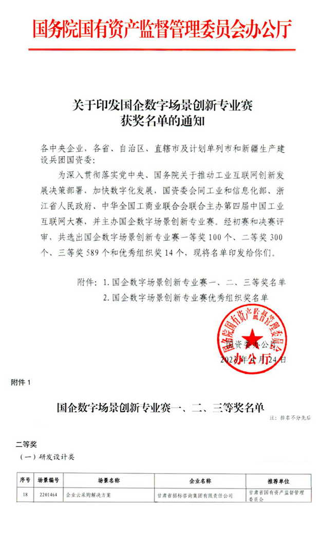 近日,國(guó)務(wù)院國(guó)資委公布了首屆“國(guó)企數(shù)字場(chǎng)景創(chuàng)新專(zhuān)業(yè)賽”獲獎(jiǎng)名單。甘肅工程咨詢(xún)集團(tuán)組織推薦的“甘招企業(yè)云采購(gòu)平臺(tái)”創(chuàng)新場(chǎng)景,在全國(guó)2007家參賽企業(yè)推薦的3277個(gè)場(chǎng)景中脫穎而出,榮獲二等獎(jiǎng)!