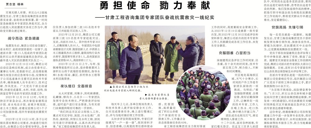 1月15日,《甘肅日報》第4版刊載《勇?lián)姑?勠力奉獻(xiàn)——甘肅工程咨詢集團(tuán)專家團(tuán)隊(duì)奮戰(zhàn)抗震救災(zāi)一線紀(jì)實(shí)》。該報道全面反映了集團(tuán)公司黨委心系災(zāi)區(qū)、聞令而動的一系列擔(dān)當(dāng)作為務(wù)實(shí)舉措,深度展現(xiàn)了專家團(tuán)隊(duì)和干部職工向險而行、甘于奉獻(xiàn)的抗震救災(zāi)生動實(shí)踐,進(jìn)一步凝聚起奮力奪取抗震救災(zāi)全面勝利的強(qiáng)大力量。