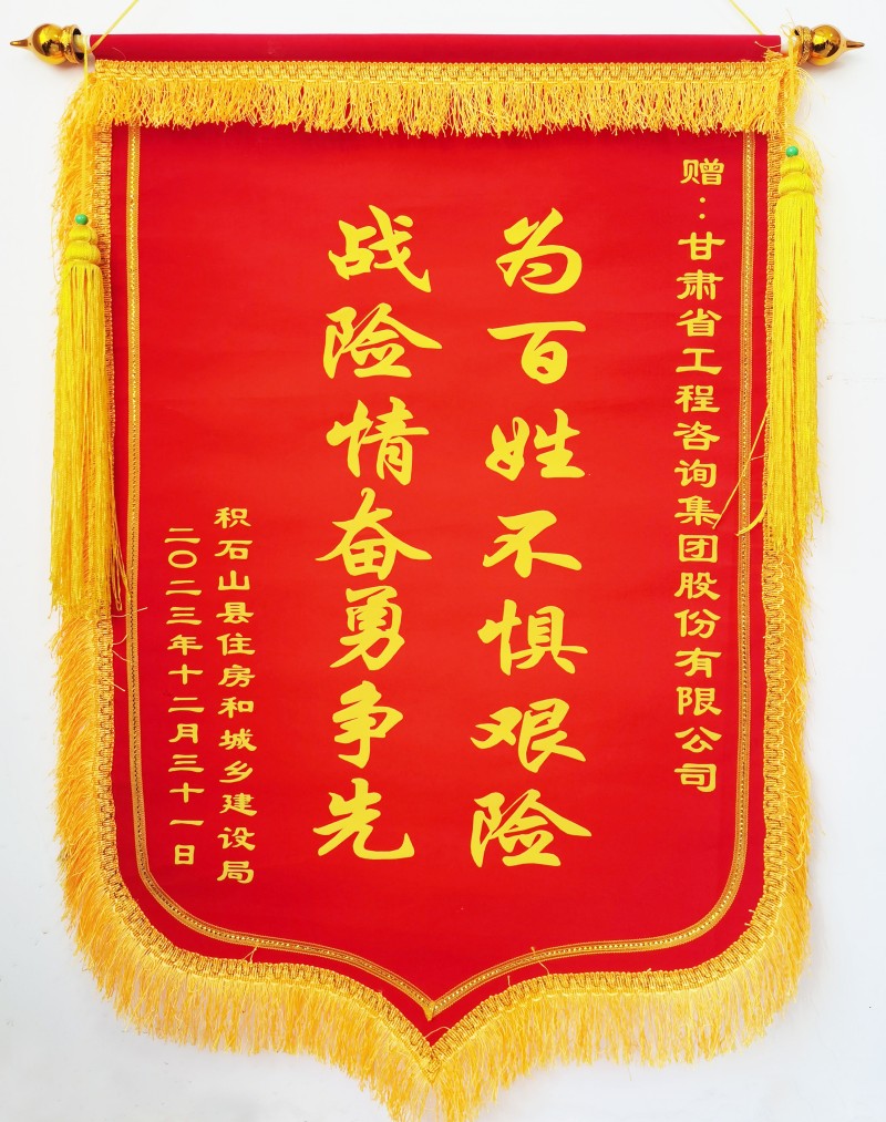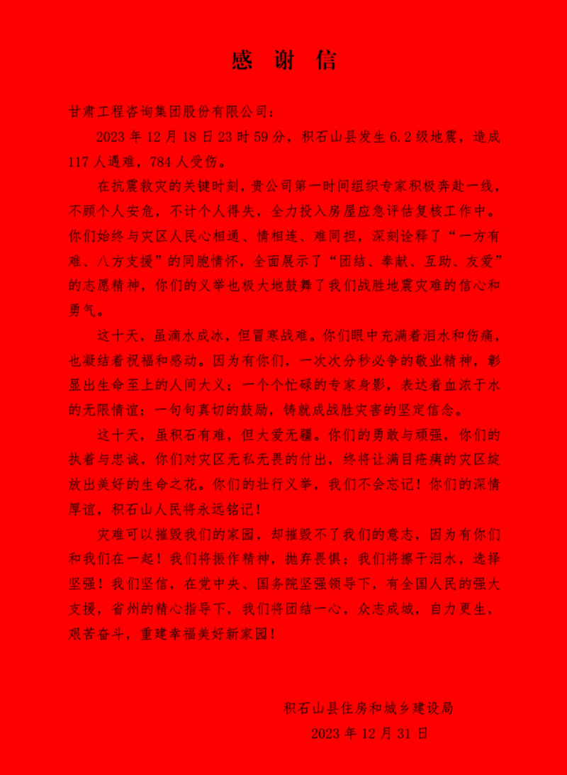 1月3日上午,積石山縣住房和城鄉(xiāng)建設局向甘肅工程咨詢集團贈送“為百姓不懼艱險,戰(zhàn)險情奮勇爭先”錦旗,并發(fā)來《感謝信》,對在抗震救災關鍵時刻奔赴災區(qū)開展房屋應急評估工作的專家表達感謝和敬意。