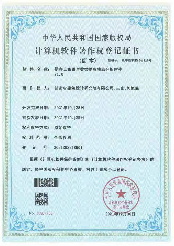 近日,從國(guó)家版權(quán)局傳來好消息,根據(jù)《計(jì)算機(jī)軟件保護(hù)條例》《計(jì)算機(jī)軟件著作權(quán)登記辦法》規(guī)定,甘肅省建筑設(shè)計(jì)研究院有限公司工程勘察院研發(fā)的“勘察點(diǎn)布置與數(shù)據(jù)提取輔助分析軟件”,經(jīng)專家審核,授予計(jì)算機(jī)軟件著作權(quán)登記證書。