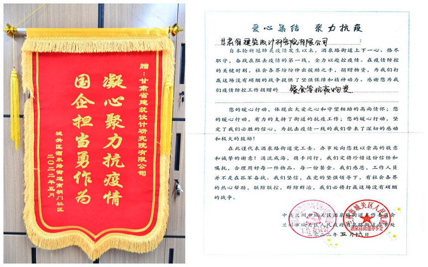 凝心聚力抗疫情 國企擔(dān)當(dāng)勇作為:酒泉路街道向甘肅省建筑設(shè)計研究院有限公司贈送錦旗