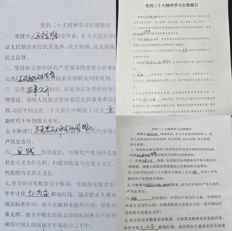 開(kāi)展答卷測(cè)試,檢驗(yàn)學(xué)習(xí)成效。招標(biāo)咨詢(xún)集團(tuán)第三黨支部所屬咨詢(xún)中心采取線上視頻會(huì)議的方式組織全體黨員居家學(xué)習(xí)黨的二十大報(bào)告原文,通過(guò)學(xué)原文、悟原理、反復(fù)學(xué)、時(shí)常悟,深刻領(lǐng)會(huì)和準(zhǔn)確把握?qǐng)?bào)告的精神實(shí)質(zhì)、豐富內(nèi)涵和核心要義。同時(shí),對(duì)黨的二十大報(bào)告相關(guān)知識(shí)開(kāi)展應(yīng)知應(yīng)會(huì)測(cè)試,通過(guò)答卷的方式檢驗(yàn)黨員干部對(duì)黨的二十大精神的理解和把握,達(dá)到以考促學(xué)、以學(xué)促用、學(xué)用結(jié)合、知行合一的目的。