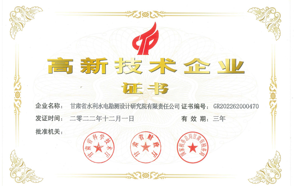 日前,甘肅省水利水電勘測(cè)設(shè)計(jì)研究院有限責(zé)任公司獲得甘肅省科技廳、甘肅省財(cái)政廳、國(guó)家稅務(wù)總局甘肅省稅務(wù)局聯(lián)合頒發(fā)的“高新技術(shù)企業(yè)證書”(證書編號(hào):GR202262000470),標(biāo)志著水電設(shè)計(jì)院正式邁入國(guó)家高新技術(shù)企業(yè)行列,是企業(yè)發(fā)展的又一個(gè)重要里程碑。