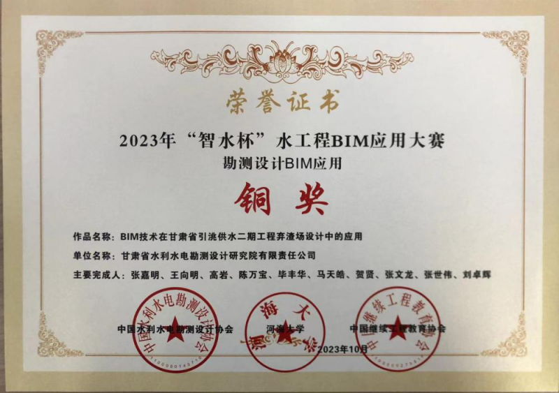 近日,中國水利水電勘測設(shè)計協(xié)會發(fā)布了2023年“智水杯”水工程BIM應(yīng)用大賽獲獎項目,省水電設(shè)計院申報的《BIM技術(shù)在甘肅省引洮供水二期工程棄渣場設(shè)計中的應(yīng)用》獲得勘測設(shè)計MIM應(yīng)用銅獎。